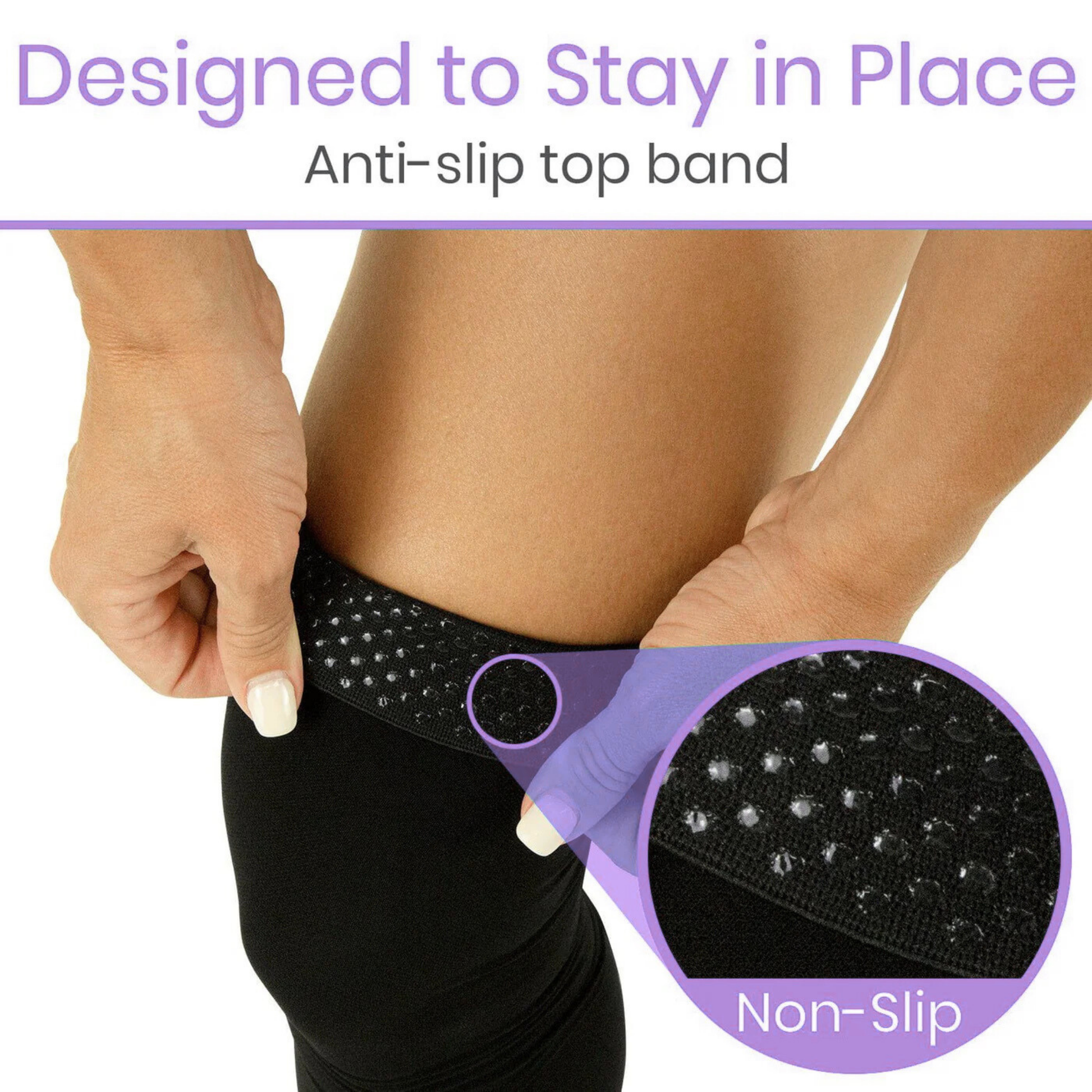 ✓ Non‑slip silicone top band: a stay‑put thigh cuff with a silicone grip keeps the stocking from rolling down so you don’t have to fuss with it.