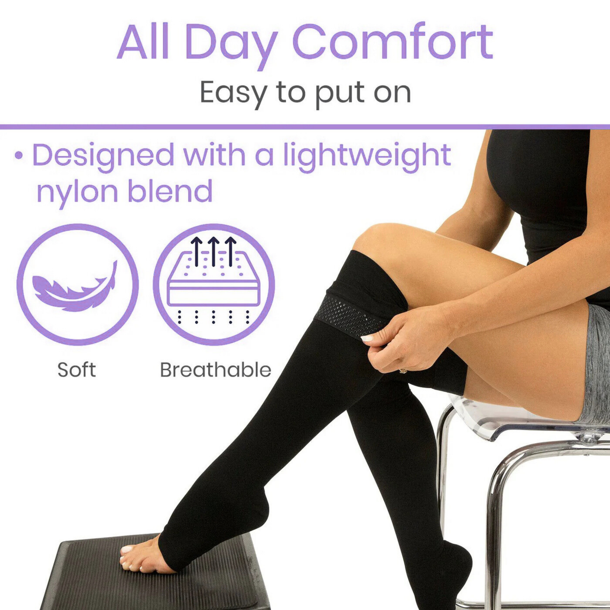 These thigh‑high stockings deliver clinical-grade relief in a simple, comfortable design. Slip them on and enjoy graduated 15‑20 mmHg compression that helps reduce swelling and fatigue in your feet, ankles and calves.