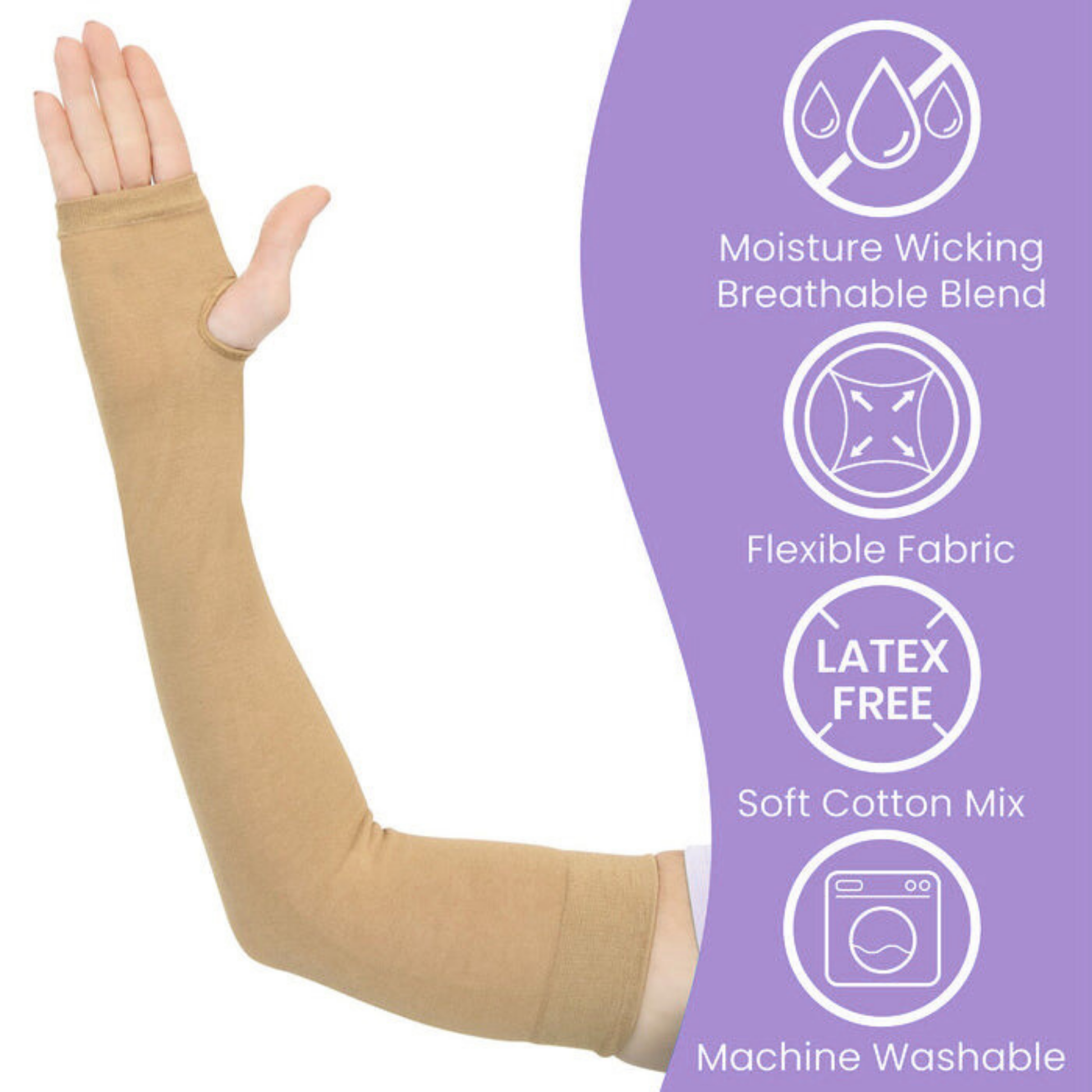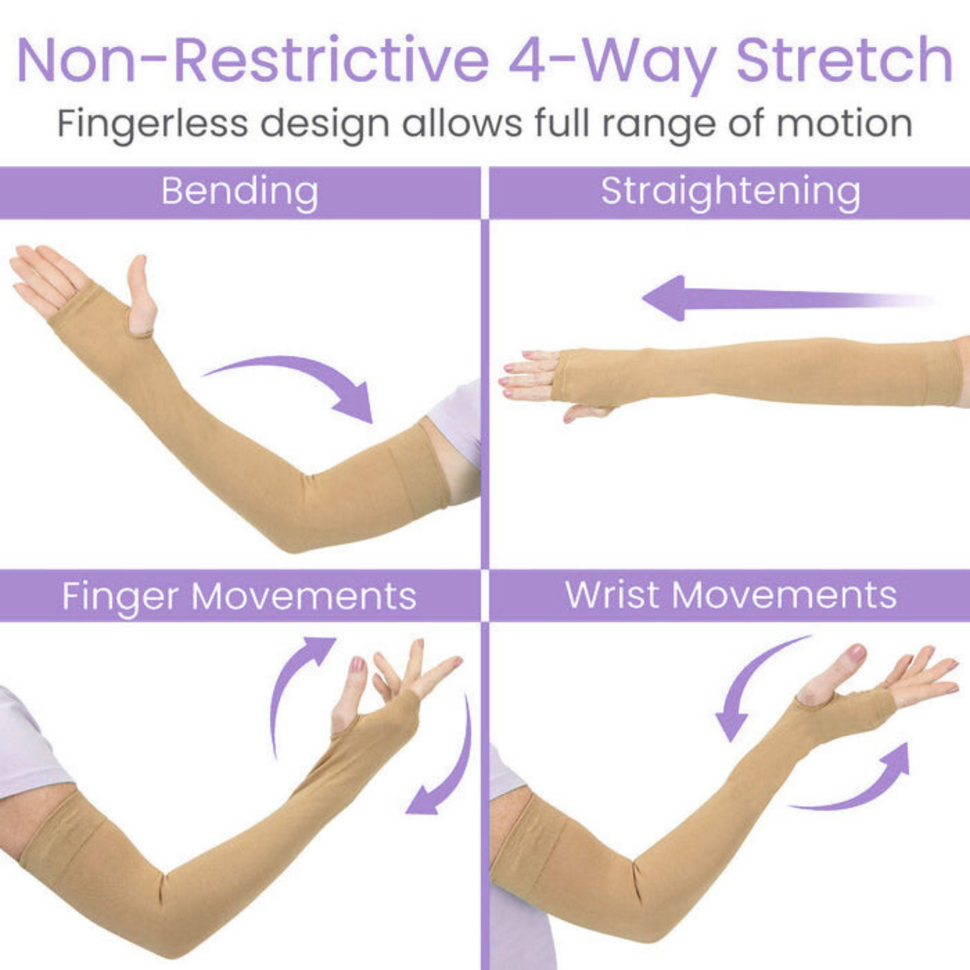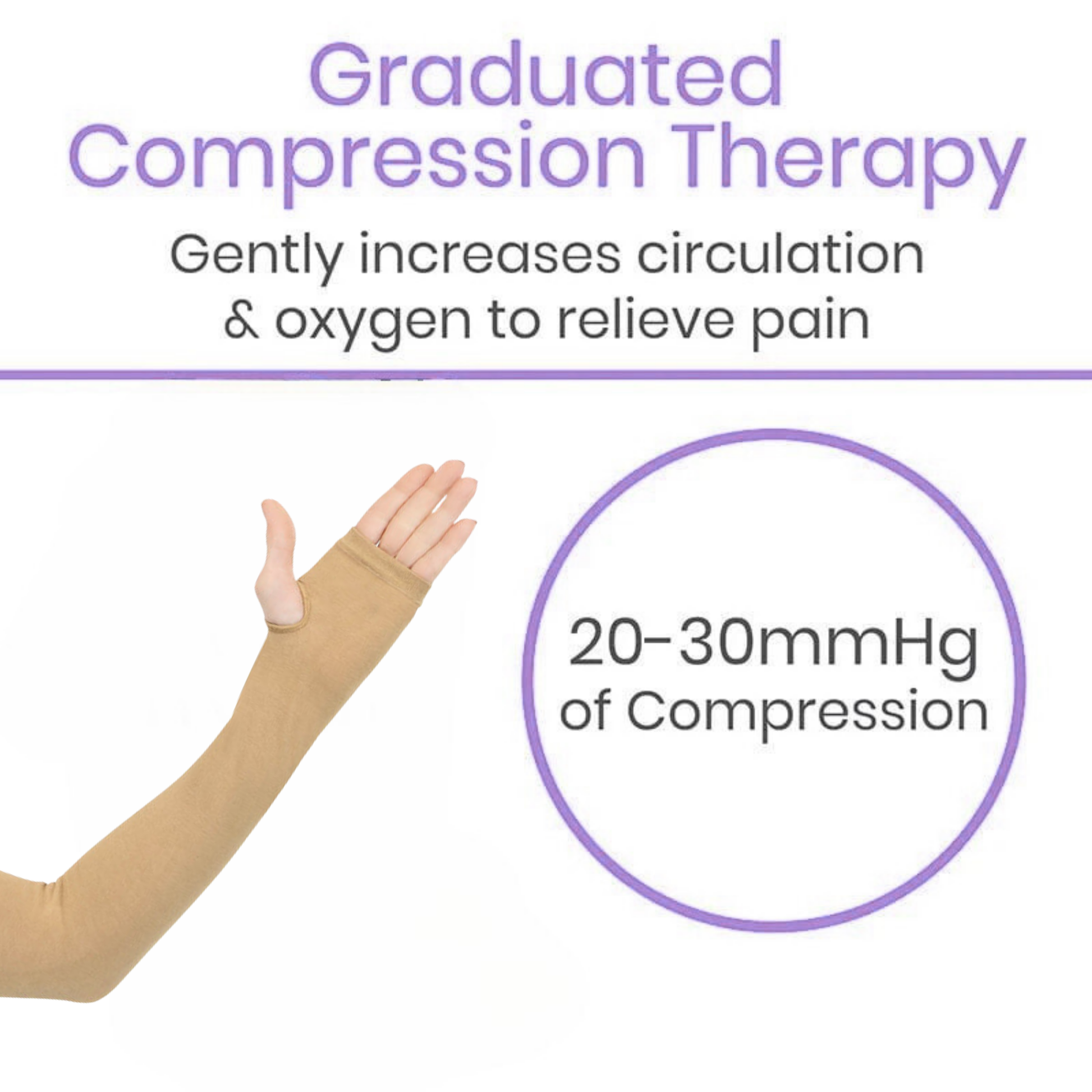 Therapeutic Arm CompressionGraduated 20-30mmHg compression technology provides targeted lymphatic support from fingertips to upper arm while maintaining therapeutic compression integrity. Medical-grade gauntlet design with open thumb construction ensures complete coverage and protective support during extended wear. Eliminates the gaps of traditional arm compression garment application.