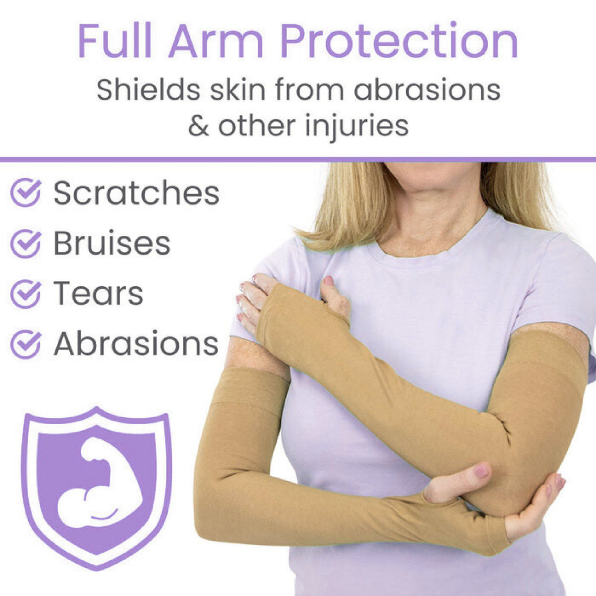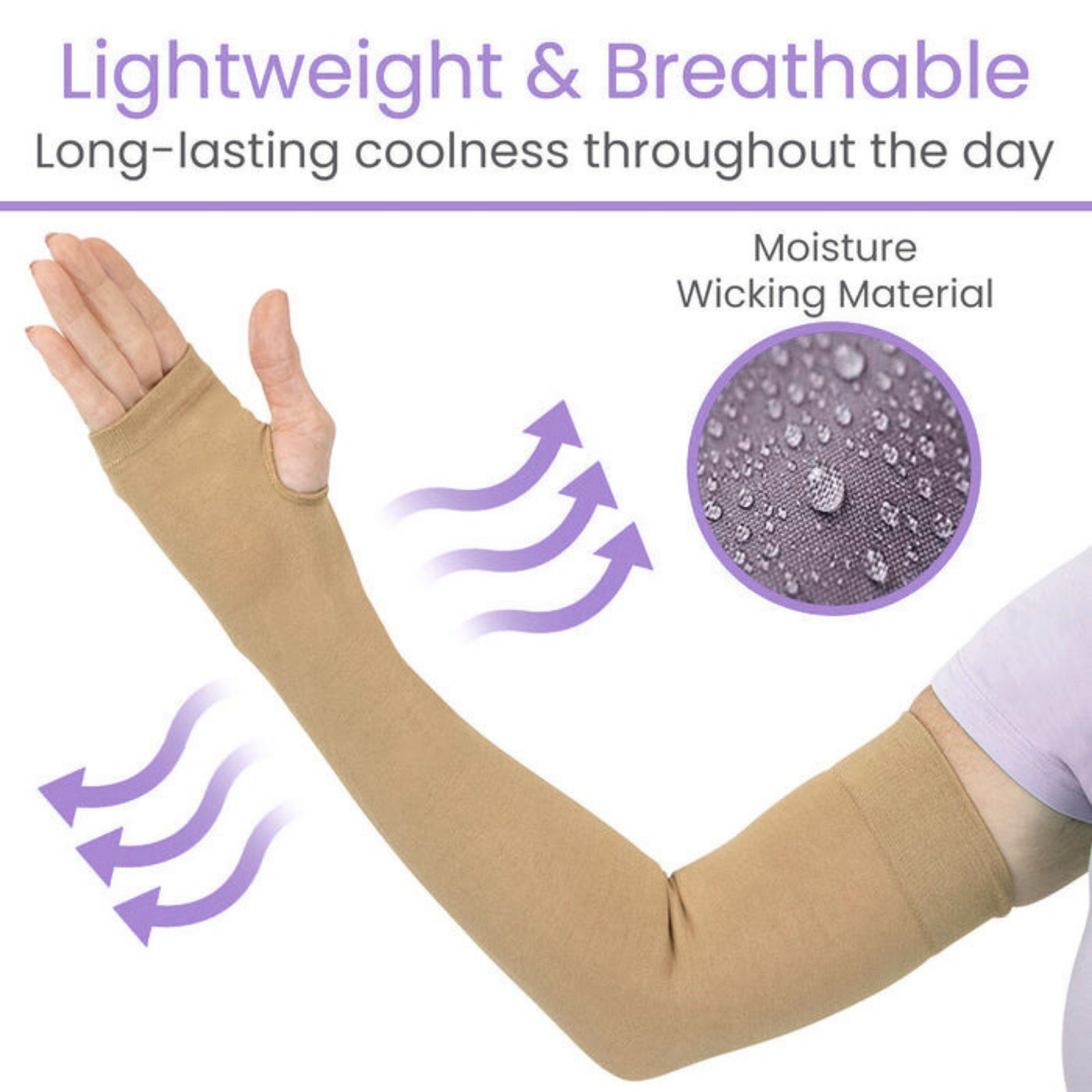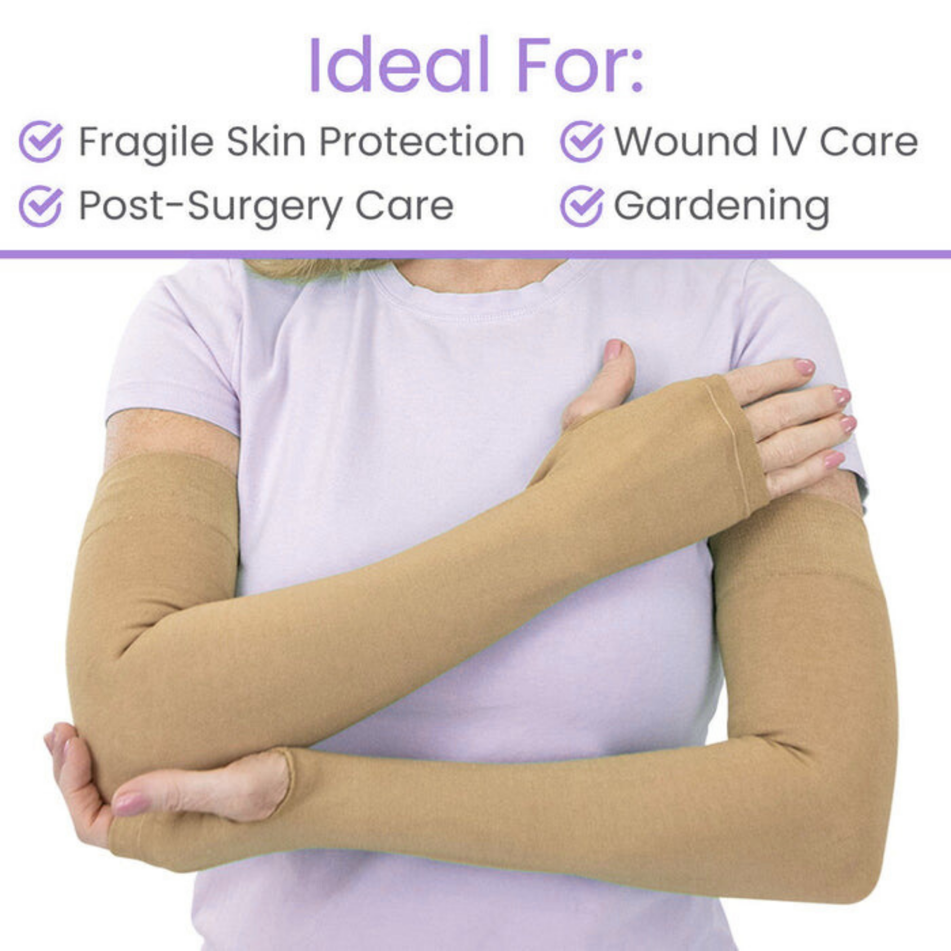Therapeutic Arm CompressionGraduated 20-30mmHg compression technology provides targeted lymphatic support from fingertips to upper arm while maintaining therapeutic compression integrity. Medical-grade gauntlet design with open thumb construction ensures complete coverage and protective support during extended wear. Eliminates the gaps of traditional arm compression garment application.
